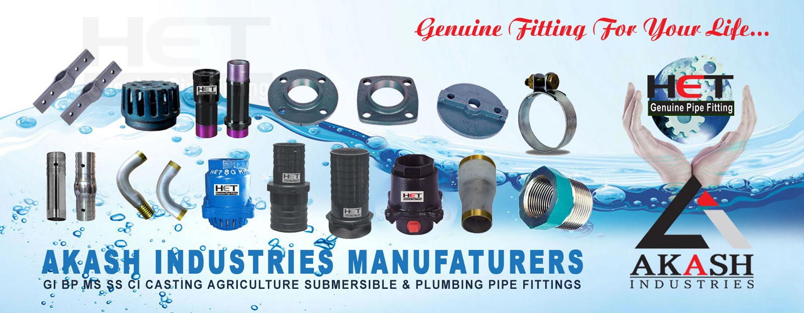 Akash Industries established year in 1994 we are sole proprietorship company leader of various CI-casting - SS MS BP GI Pipe fitting products such as all type Agricutural - Submersible & Irrigation parts manufacturers at Rajkot (Gujarat India). We are An ISO 9001:2015 Certified Company most best quality